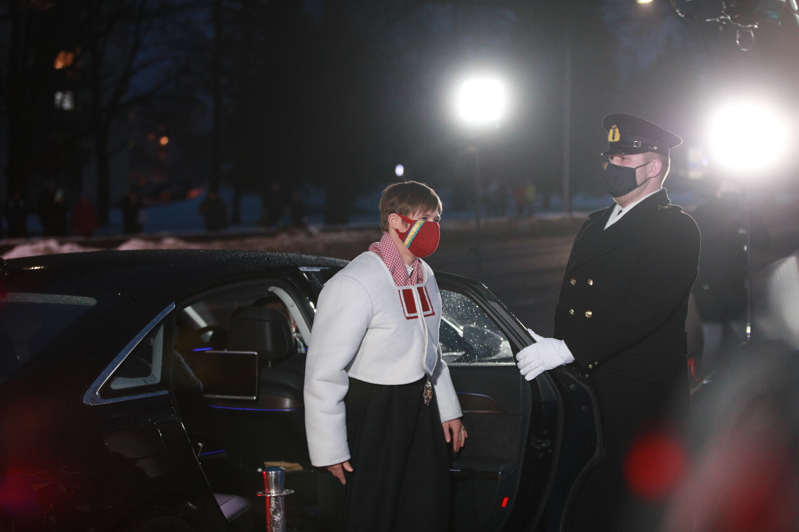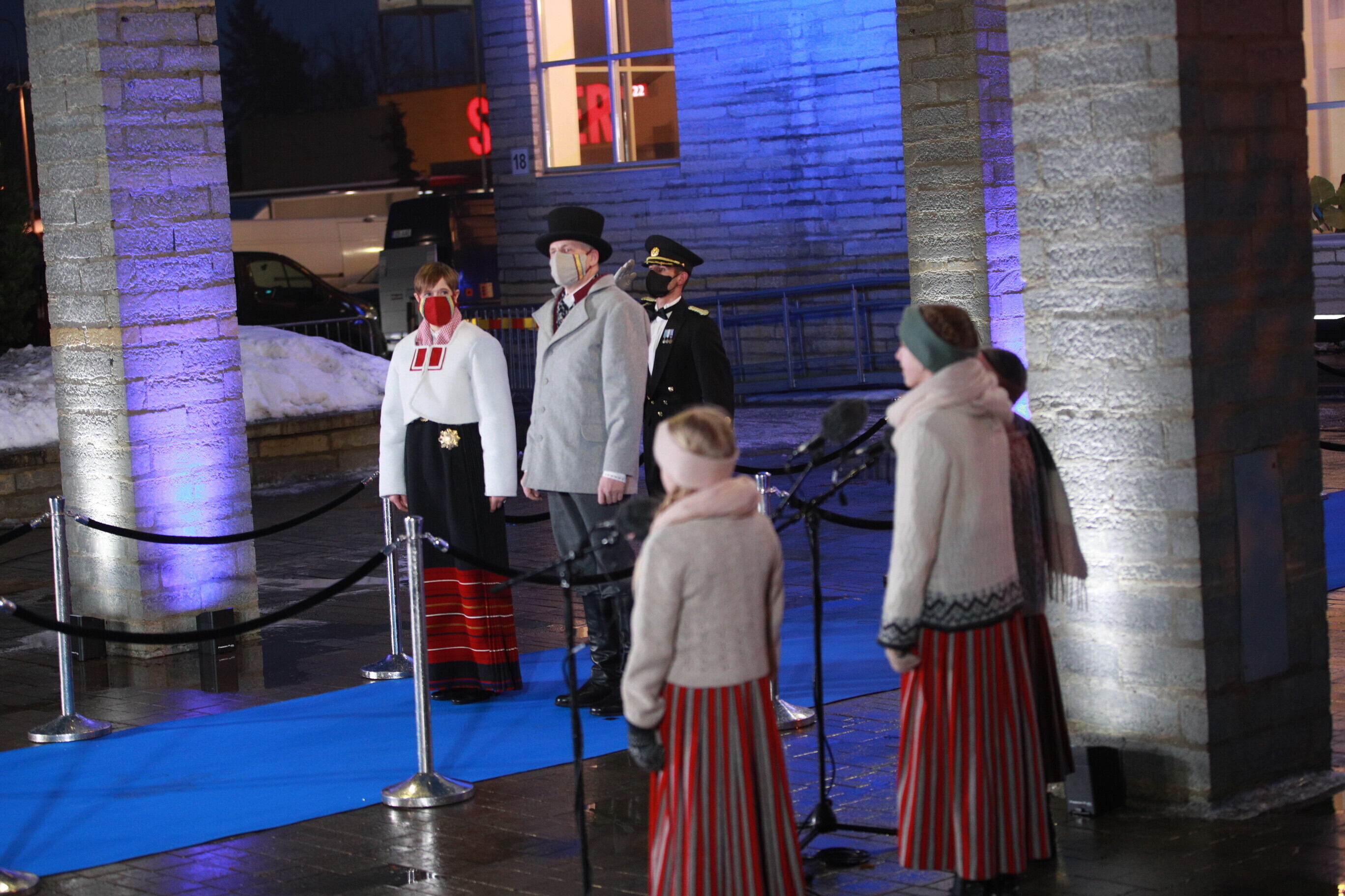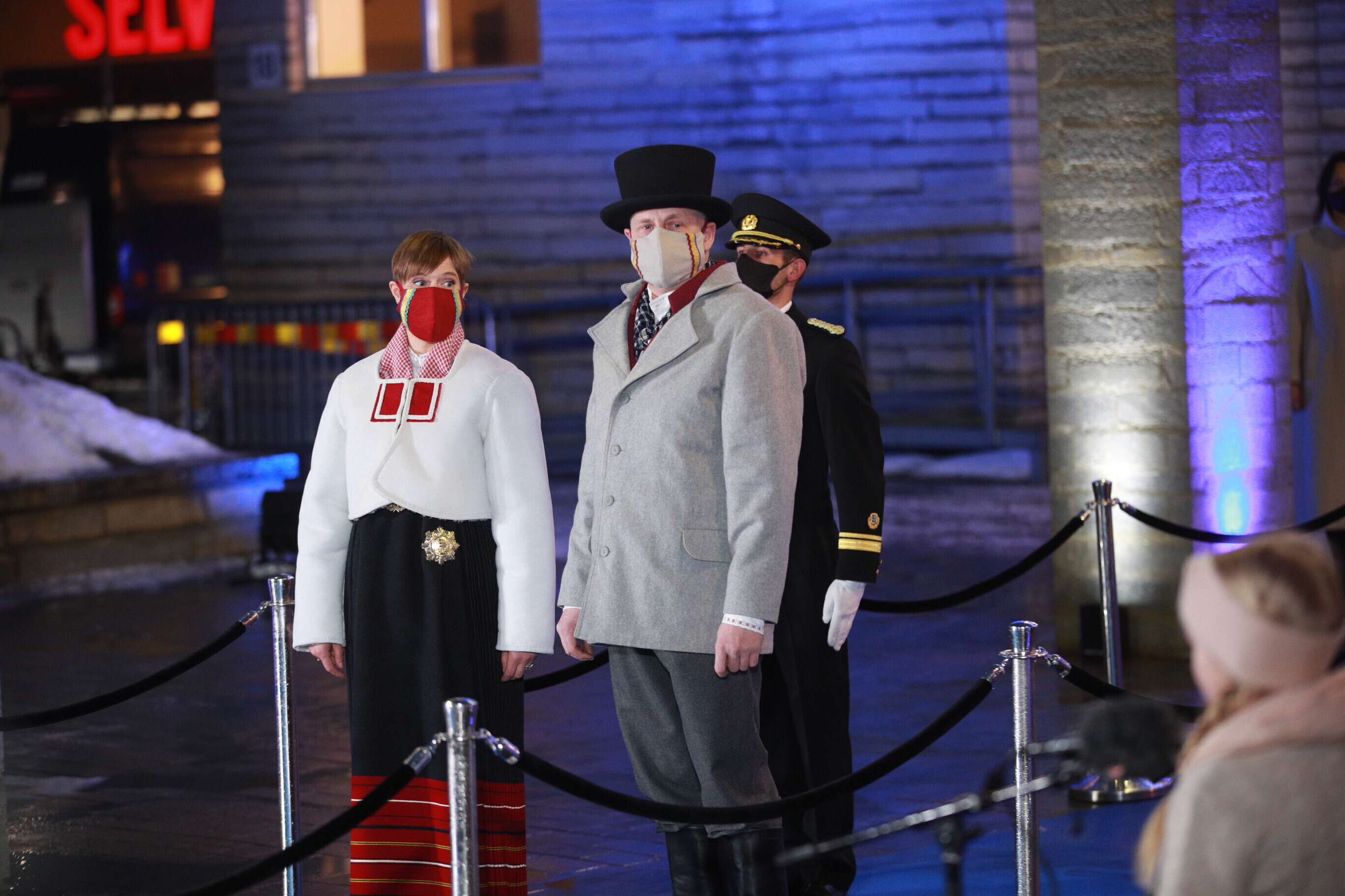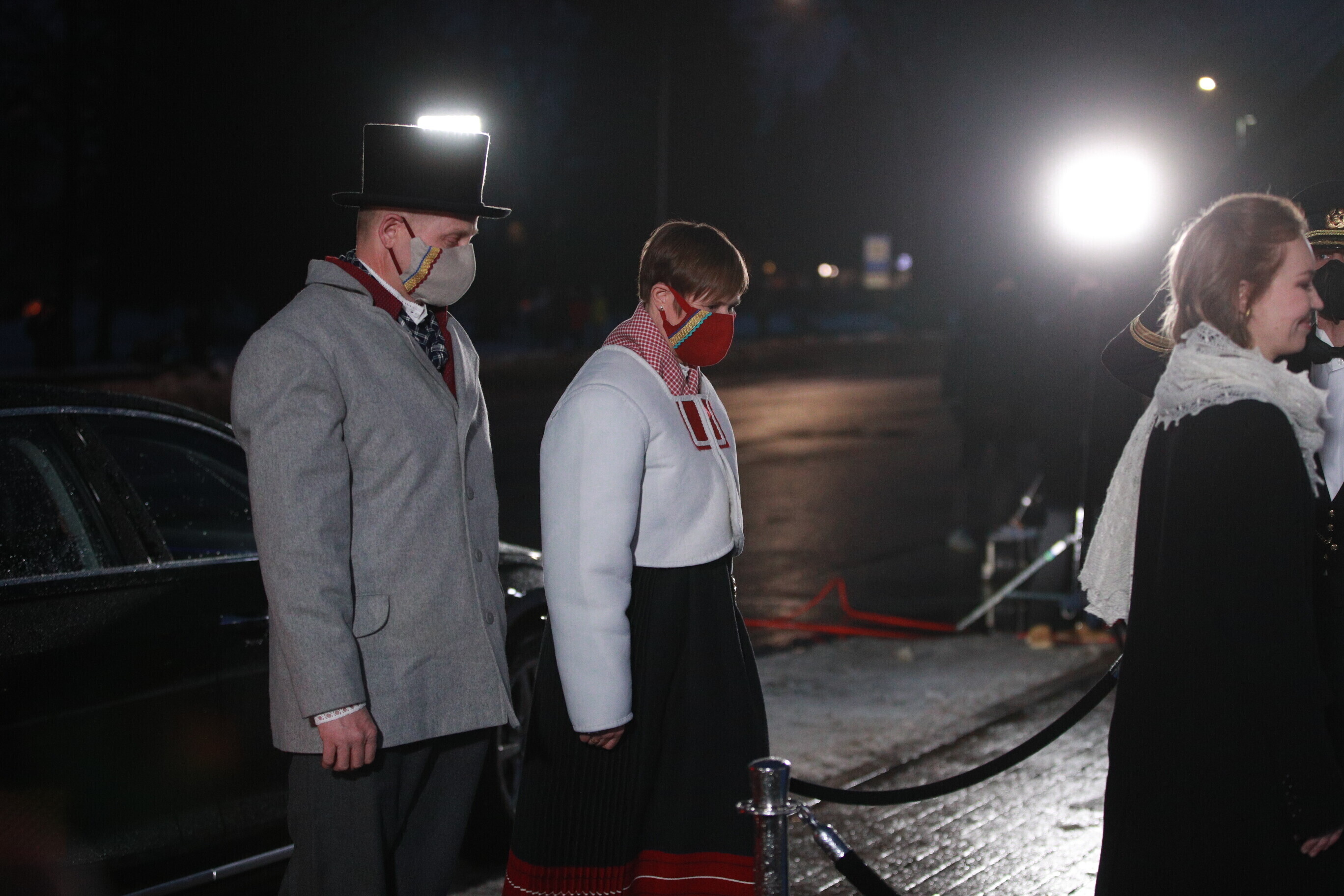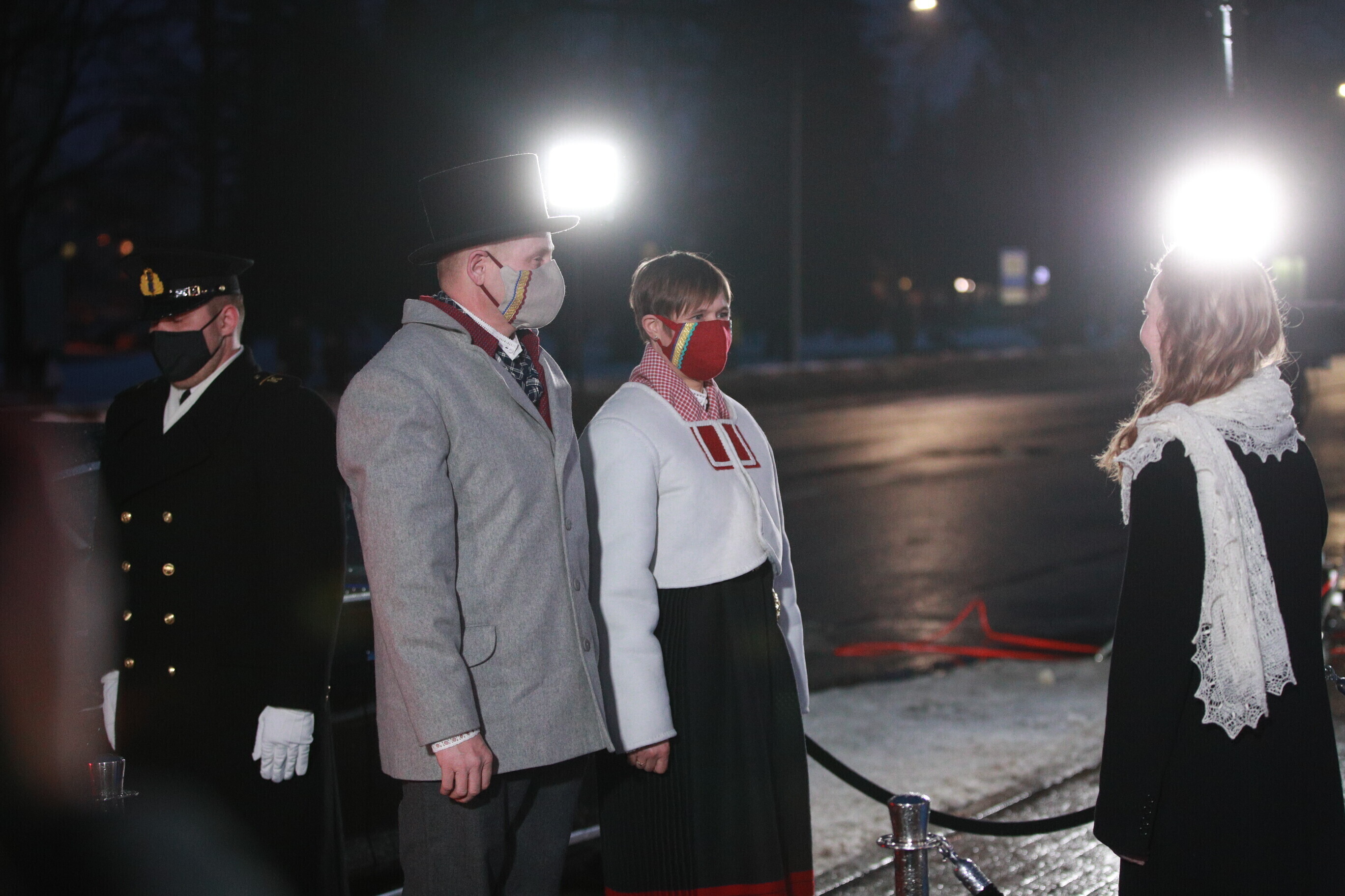 Eesti Vabariigi 103. sünnipäeva pidustustel Paides kannab president Kersti Kaljulaid koos abikaasaga Saaremaa kõige lõunapoolsema kihelkonna Jämaja rahvarõivaid.
