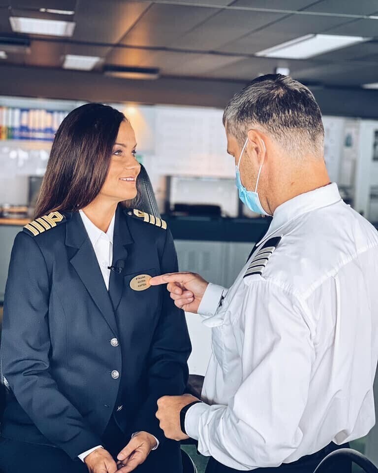 Katrin Viirpalu on tabatud laeval asuvalt kaptenisillalt ning Reimo Sildvee hoopis lennukis ohje hoidmas.