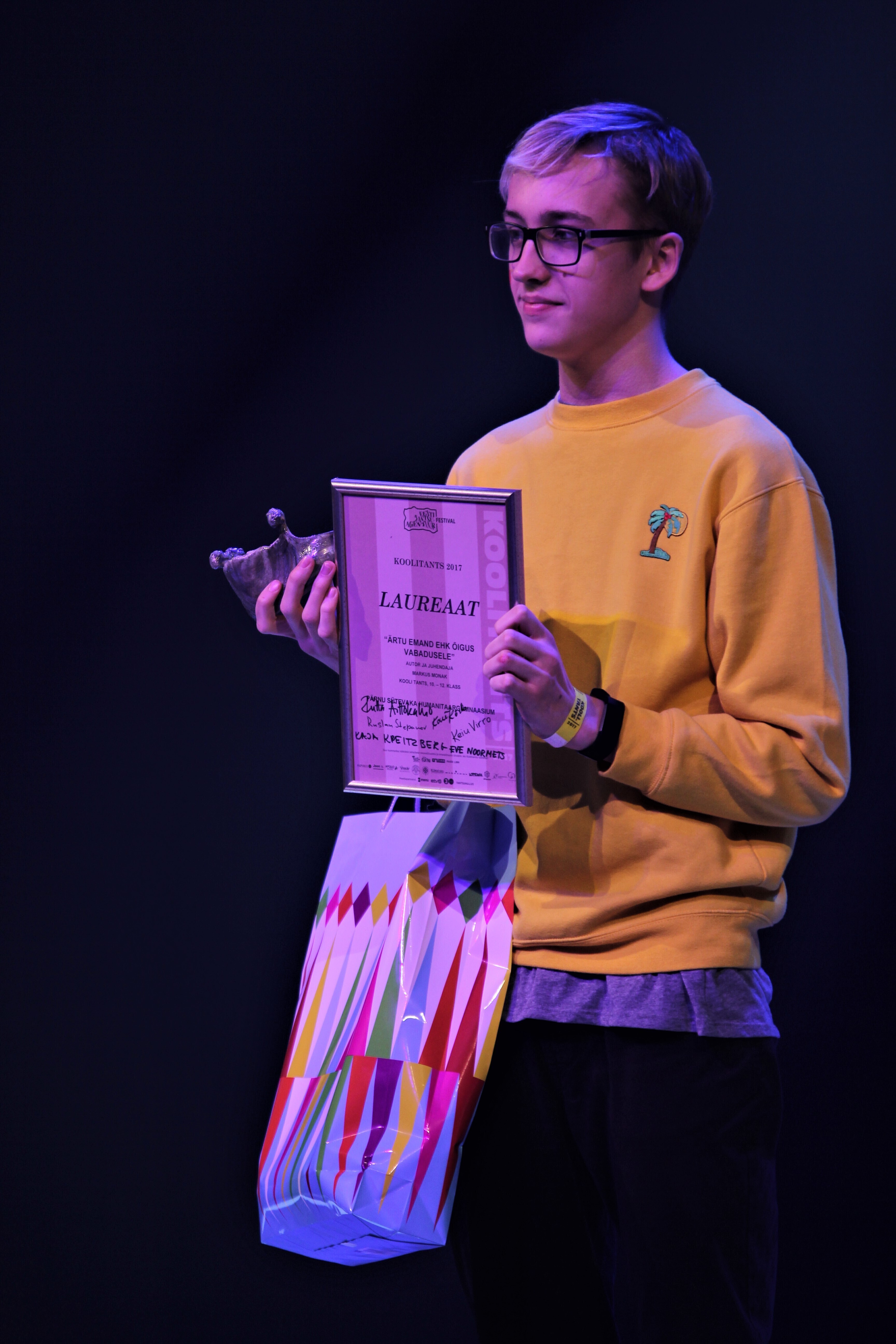 10.-12. klasside laureaaditiitli pälvis noor ja andekas tantsulooja Markus Monak Pärnu Sütevaka humanitaargümnaasiumi noortele loodud tantsu "Ärtu emand ehk õigus vabadele" eest. Sama vanuseastme nominendina läksid koju Paide gümnaasiumi 11. klassi noored tantsijad oma tantsuga "Ayele hõim" (juhendaja Liili FIlippov).