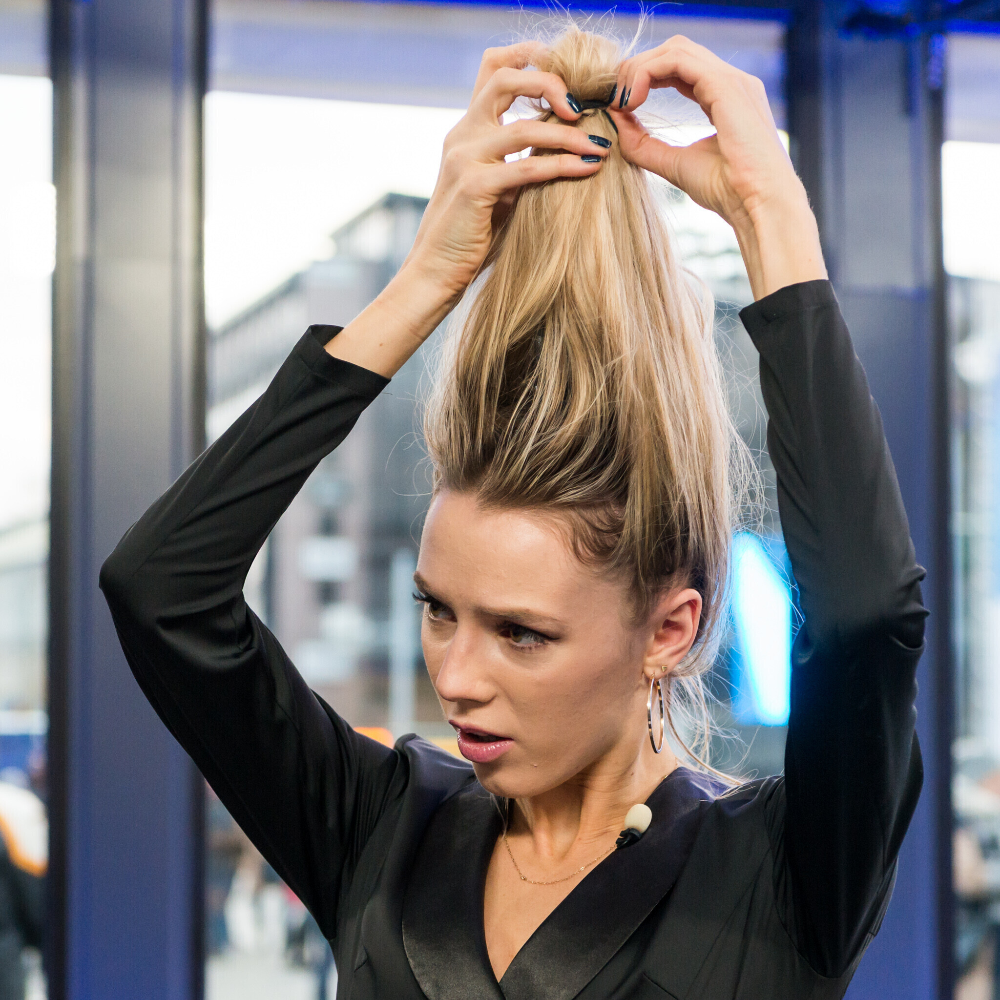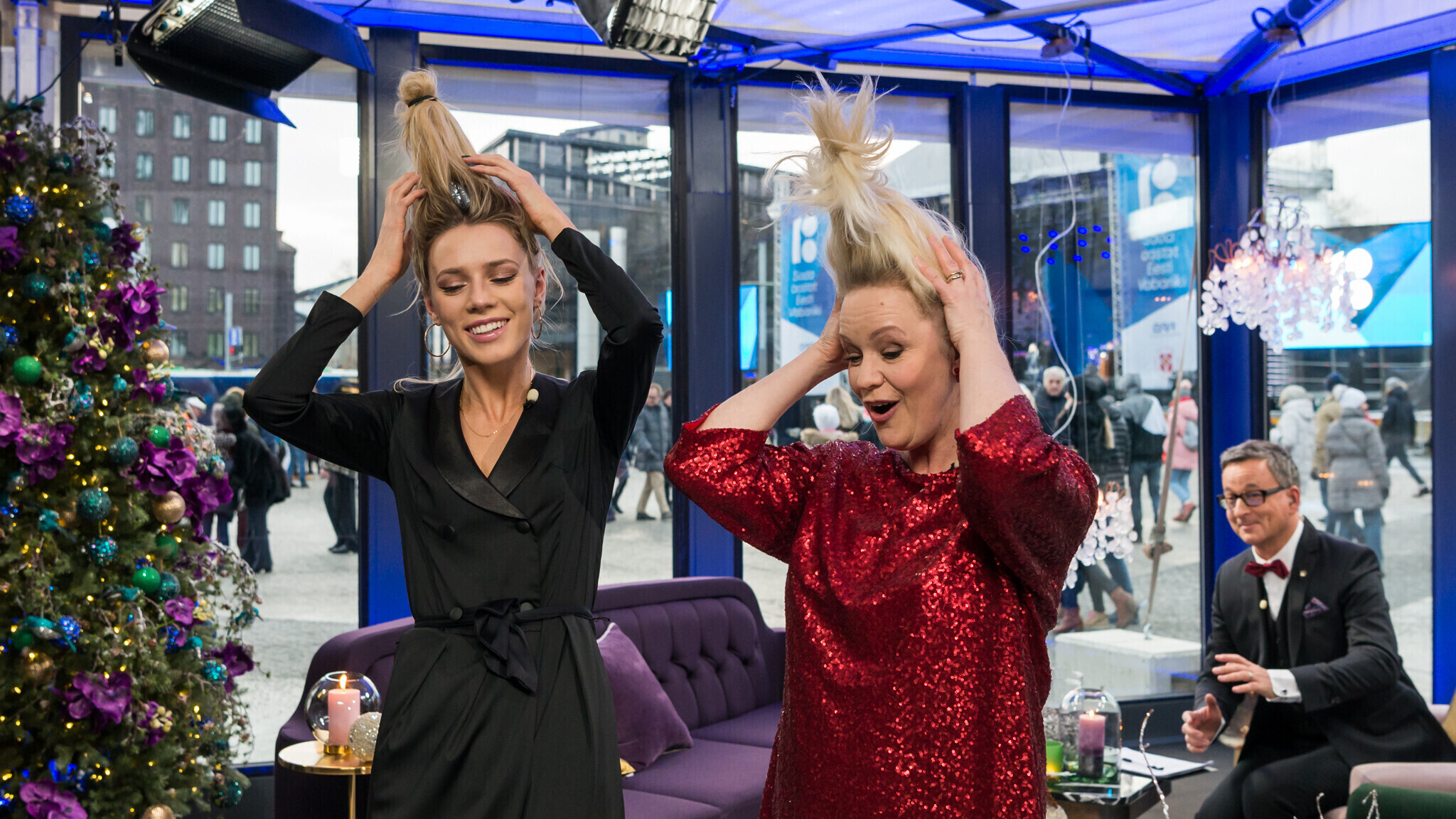 Otse-kaamerate ees proovisid Killandi ja Lemsalu aga midagi lihtsat, kuid efektset. Selleks läks vaja pudelit, juuksekummi ja pea alaspidi olekut. "Appi, mul veri valgub pähe. Esimese korra kohta on mul liiga hästi," naeris Lemsalu soengut tehes.
