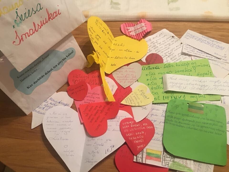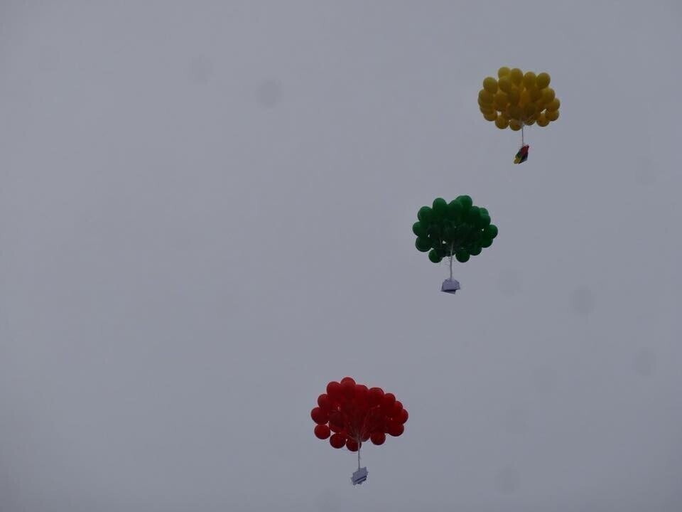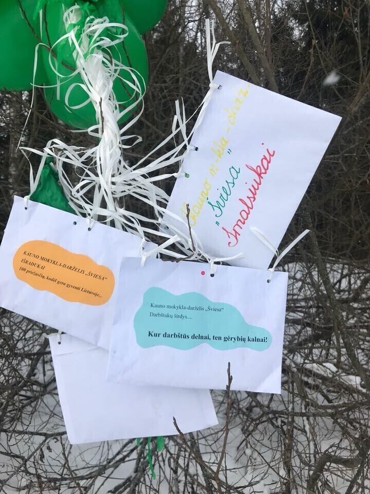 Kaunasest lendu lastud lipuvärvides kollased, rohelised ja punased õhupallid kandsid laste kirjalikke mõtteid, miks Leedus on hea elada.