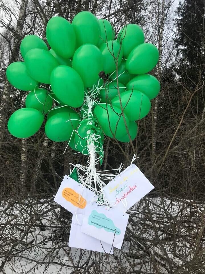 "Kena üllatus. Kaunasest lennutatud õhupallid, rohelised, maandusid minu metsas," teatas kohalik elanik Sirje Nestor oma Facebooki lehel.