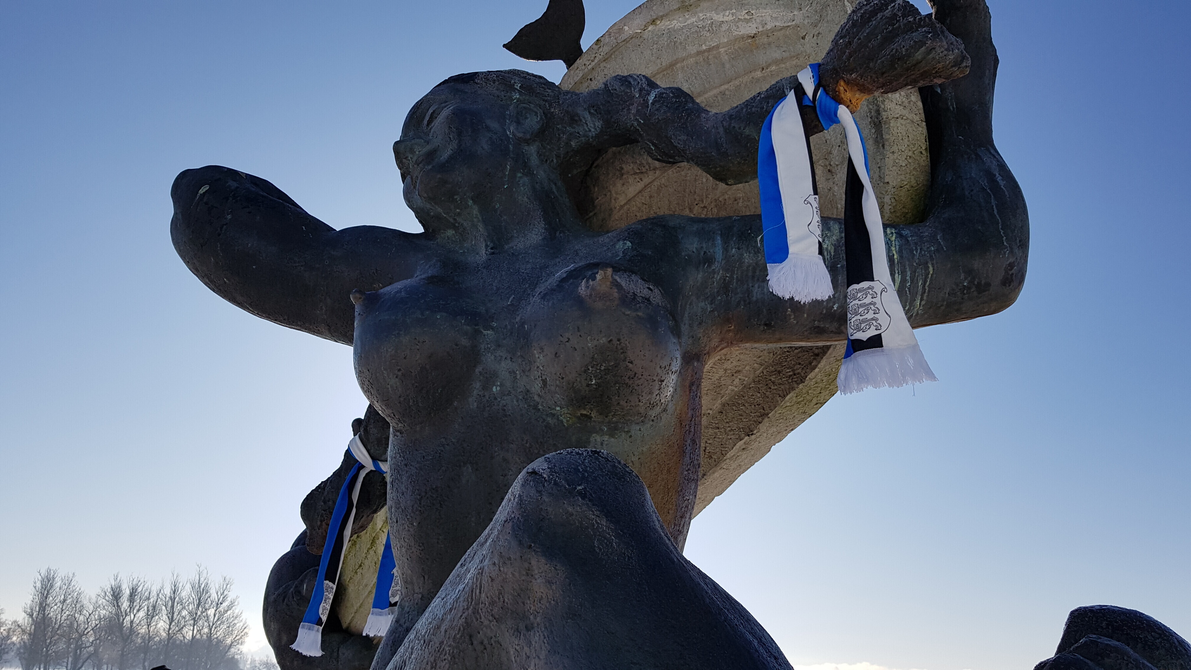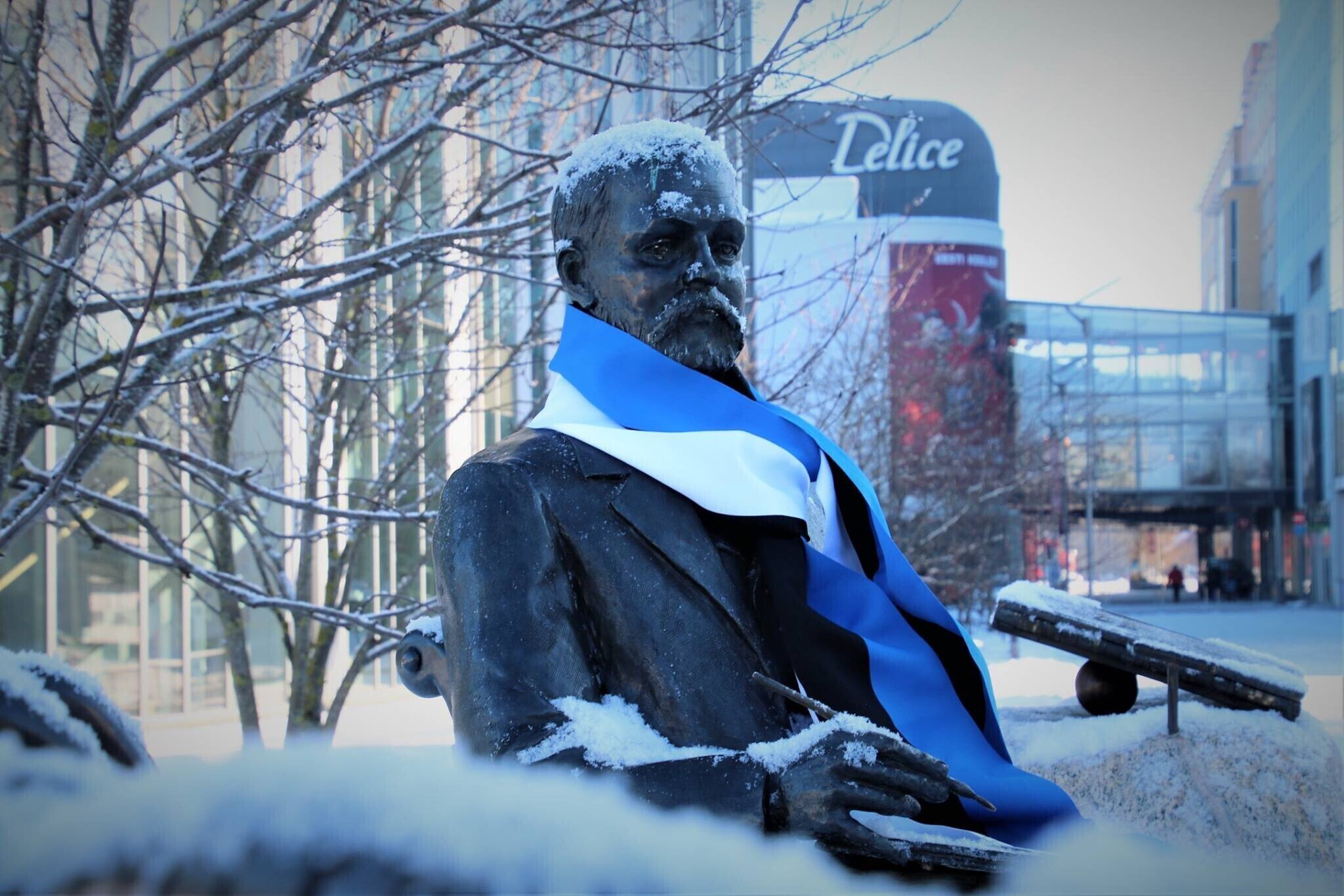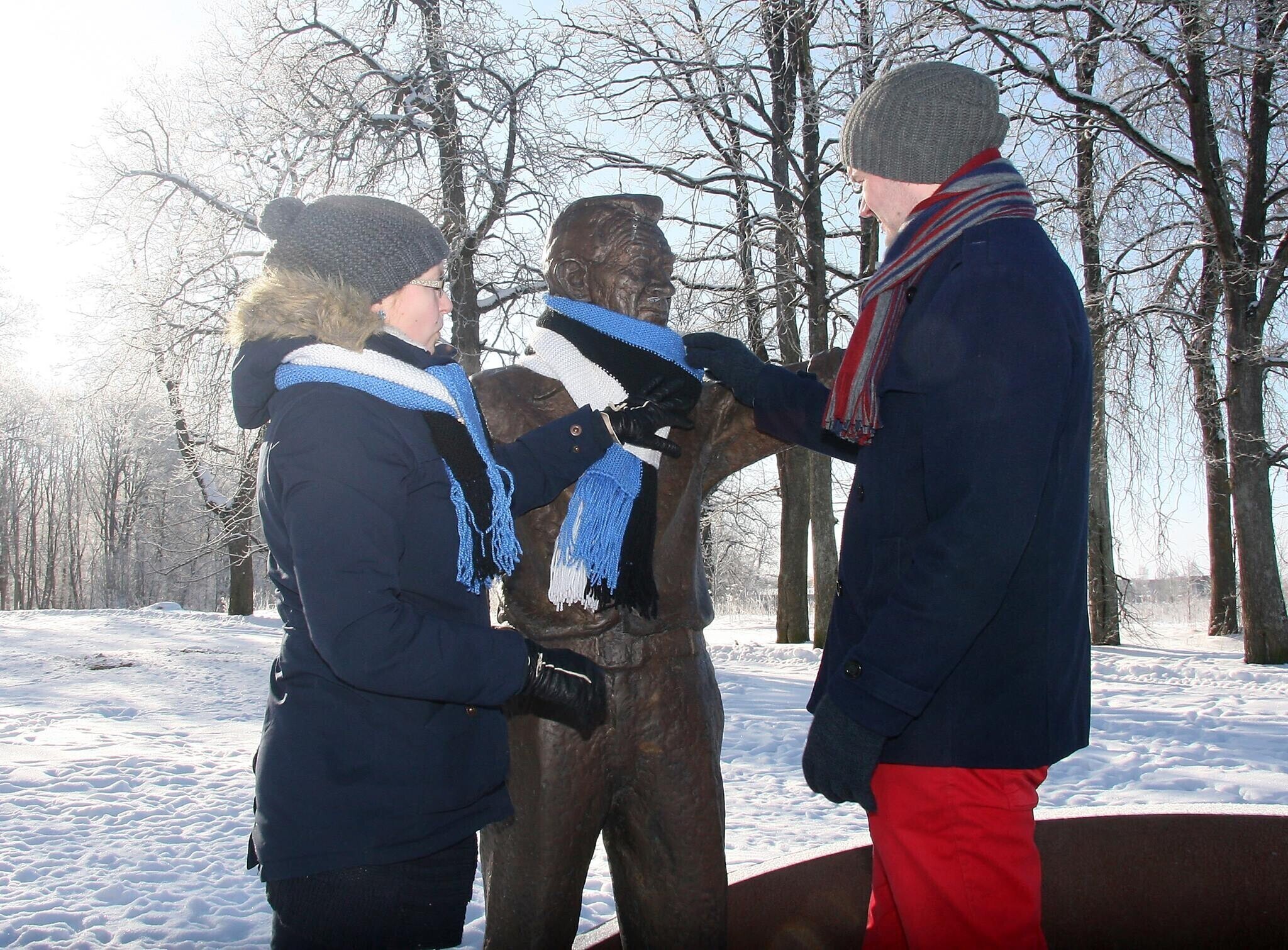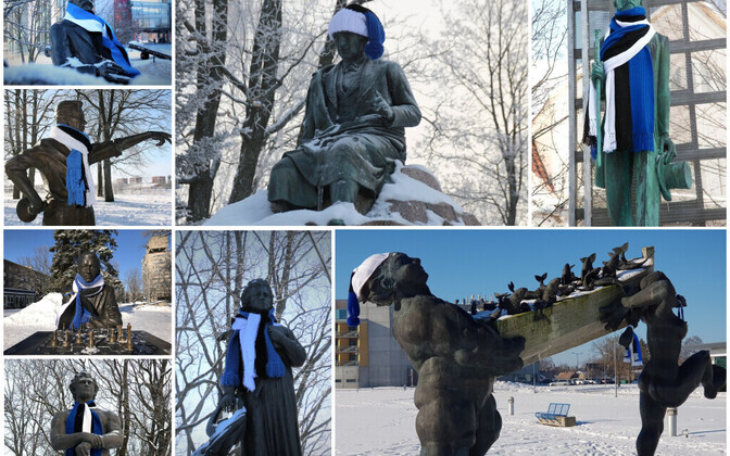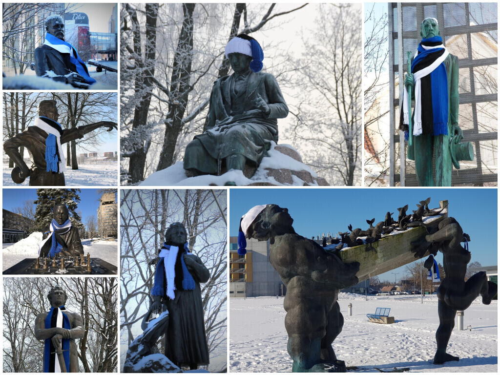 Neljapäeval, 22. veebruaril saavad üle Eesti enam kui 20 tuntud skulptuuri vabariigi 100. sünnipäeva auks kaela sinimustavelged sallid. Mõnele saab sama tooni mütski pähe pandud.